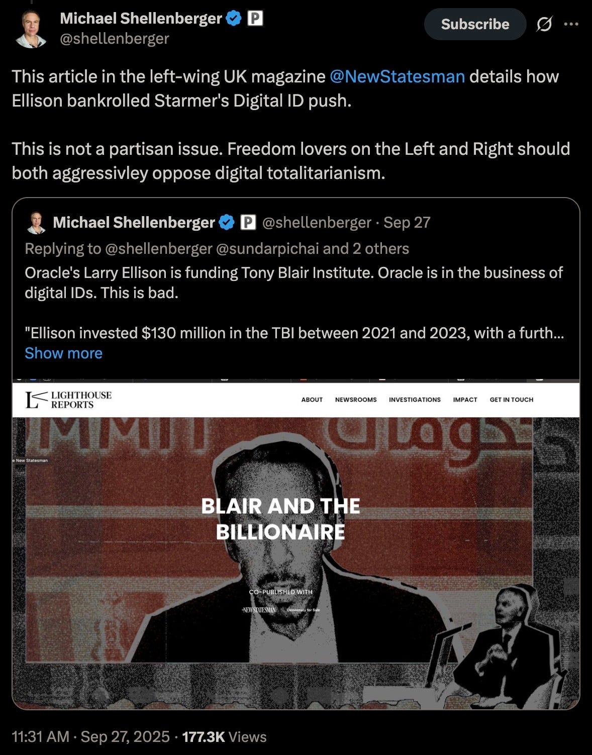 “The man behind the digital ID push is Larry Ellison, owner of Oracle, CBS, CNN, and, soon, TikTok. He wants data centralization and total surveillance. “Citizens will be on their best behavior because we’re constantly watching & recording everything that’s going on.” Terrifying.”