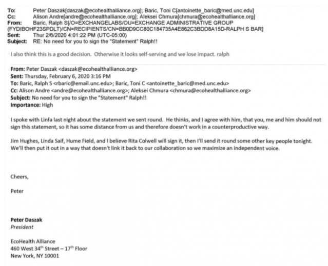 As his uncovered emails would later show, Daszak actually contacted Ralph Baric and instructed him not to sign the letter, fearing the conflict of interest it would entail, but not caring about his own, or that of the couple dozen scientists who did end up signing it.