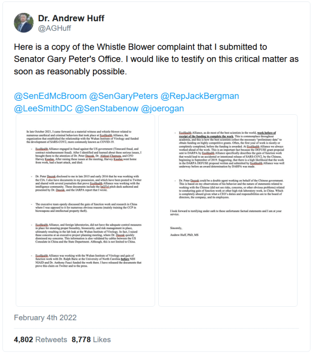 Andrew Huff, the former Vice President of EcoHealth Alliance, has come forward with a whistleblower complaint stating that Peter Daszak was a CIA asset.