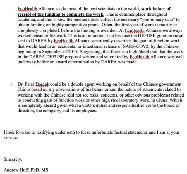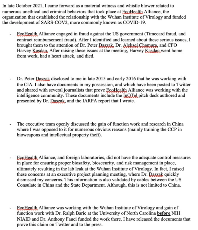 In late October 2021, Huff says he “came forward as a material witness and whistleblower related to numerous unethical and criminal behaviors that took place at EcoHealth Alliance. EcoHealth Alliance engaged in fraud against the U.S. government (Timecard Fraud and contract reimbursement fraud).” Huff “brought them to the attention of Peter Daszak, Dr. Aleksei Chamura, and CFO Harvey Kasdan. After raising these issues at the meeting, Harvey Kasdan went home from work, had a heart attack, and died.”