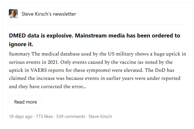 Steve Kirsch, a vocal opponent of the vaccine mandates, has written on Substack about this very topic, as well as attorney Thomas Renz’s leaked DMED data, which the DOD have been trying desperately to cover up.