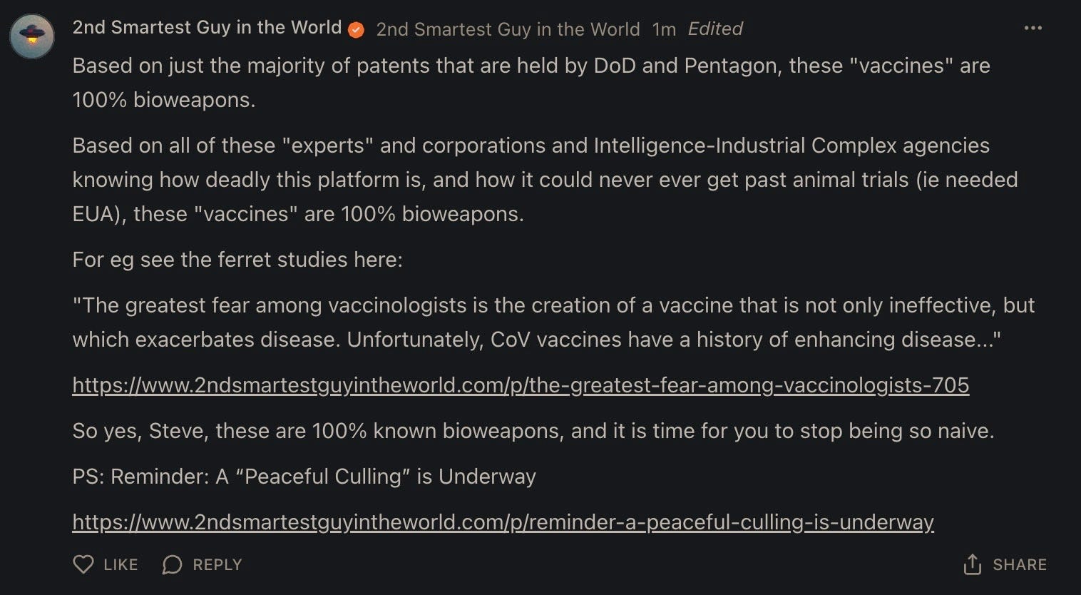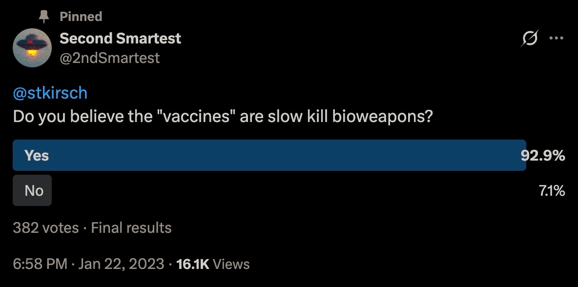 2nd Smartest Guy in the World will take any bet from Kirsch to debate the true nature of the PSYOP-19 scamdemic program, because him overlooking the patent fact patterns, “coincidental” tabletop exercises like Event 201, fraudulent “Emergency’ Use Authorizations, the devious one-two Remdesivir and intubation iatrogenesis combo, the UK’s psychological warfare nudge units that closely coordinated with the CIA, the nursing home culling, the Midazolam scandal, the gain-of-function work and the associated “vaccine” payloads, and so on and so forth, was simply not enough compelling evidence for Kirsch and his AI summarizers to come to the most rigorously honest conclusion.