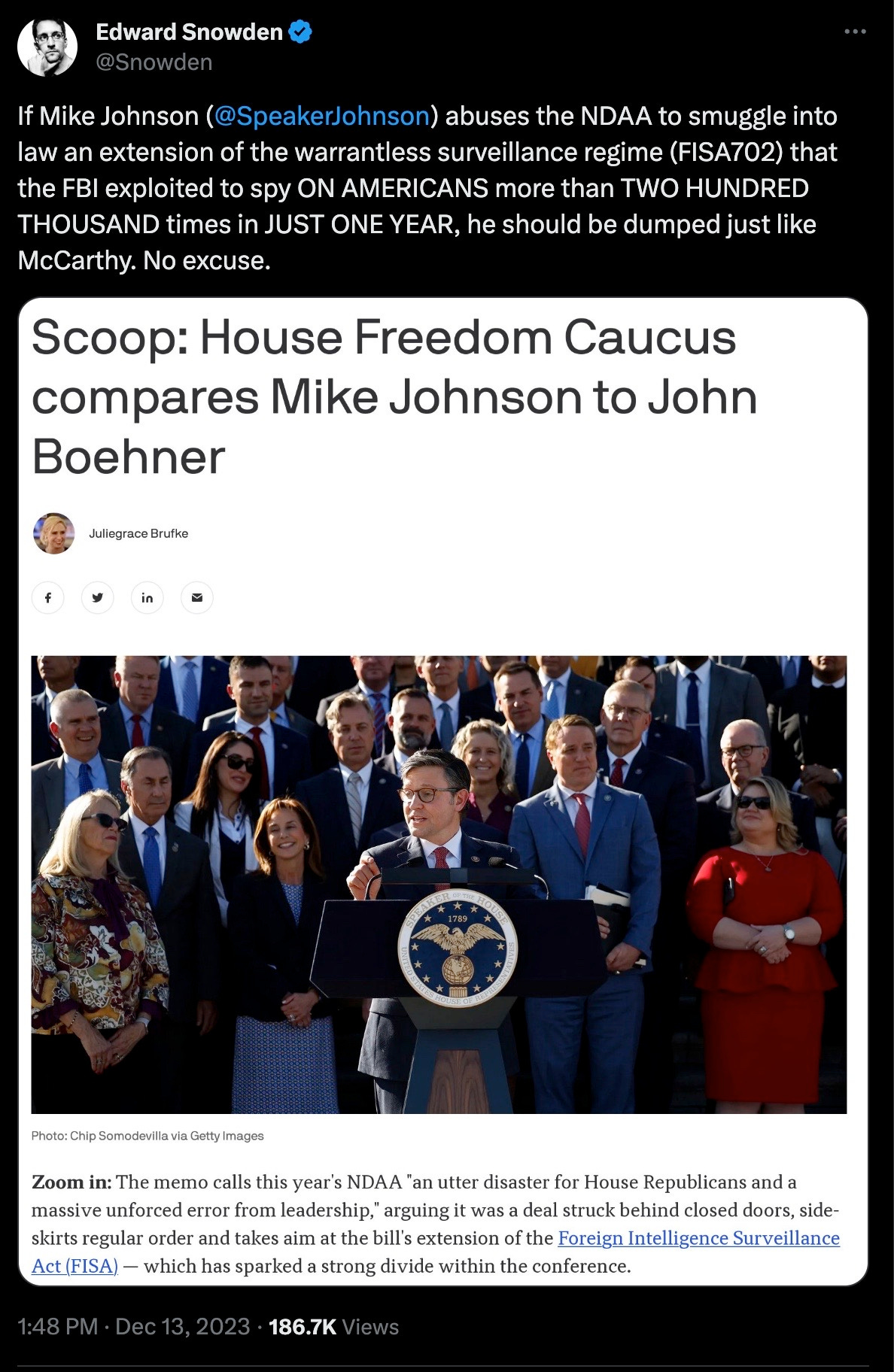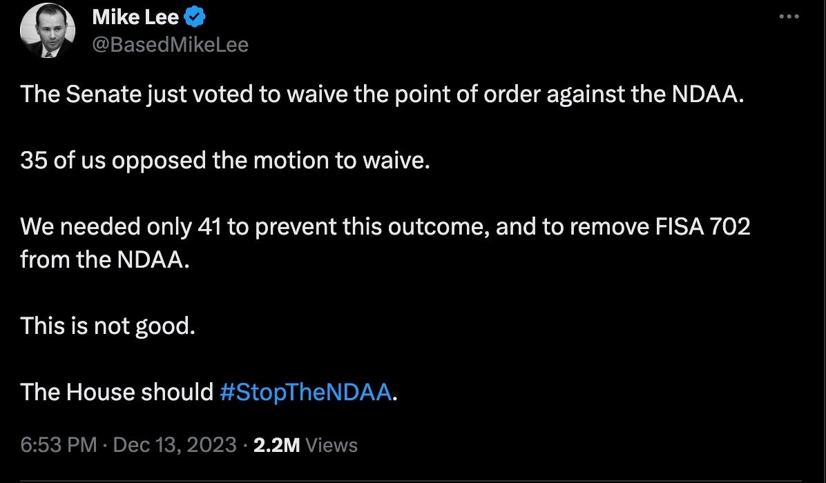 The Senate just passed the wholly unconstitutional and criminal 2024 National Defense Authorization Act (NDAA). To illegally spy on Americas, these politician puppets working actively against the Constitution and We the People have provided funding for the NDAA to the tune of $886 billion. That’s some theft via taxation to further subjugate the taxpayers that happen to be non-resident aliens of the foreign nation of Washington, D.C., and as such do not owe any said taxes, but we digress.
