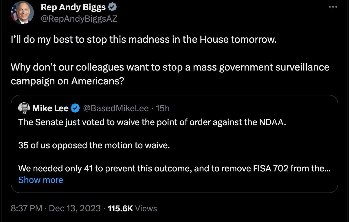 Representative Andy Biggs also appears to appreciate the dangers of this technocommunist power grab: