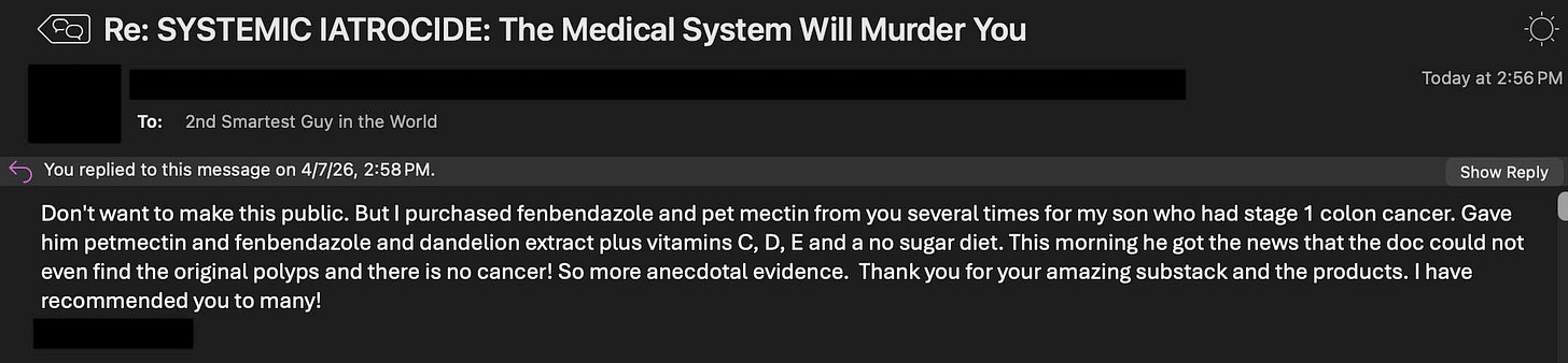 Don't want to make this public. But I purchased fenbendazole and pet mectin from you several times for my son who had stage 1 colon cancer. Gave him petmectin and fenbendazole and dandelion extract plus vitamins C, D, E and a no sugar diet. This morning he got the news that the doc could not even find the original polyps and there is no cancer! So more anecdotal evidence. Thank you for your amazing substack and the products. I have recommended you to many!