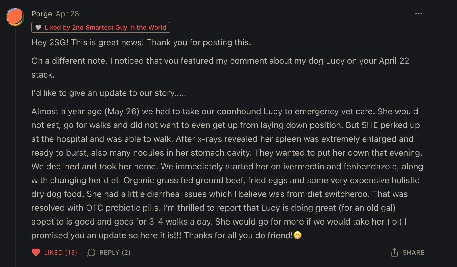 SUCCESS STORIES: IVERMECTIN & FENBENDAZOLE Testimonials - Dog Avoids Euthanasia & Stage 4 Colon Cancer College Athlete Achieves 99% drop in CEA & 86% Shrinkage of Liver Metastases