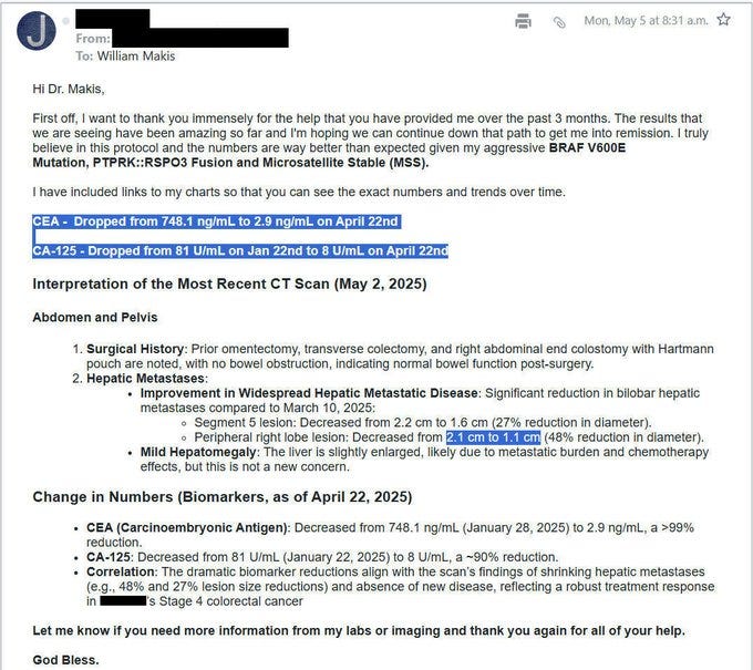 "CEA (47.2) was 748. I truly believe your protocol is working wonders for me"