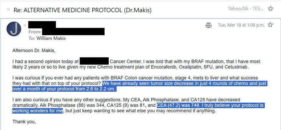 "We have already seen tumor size decrease in just 4 rounds of chemo and just over a month of your protocol from 2.6 to 2.2cm"