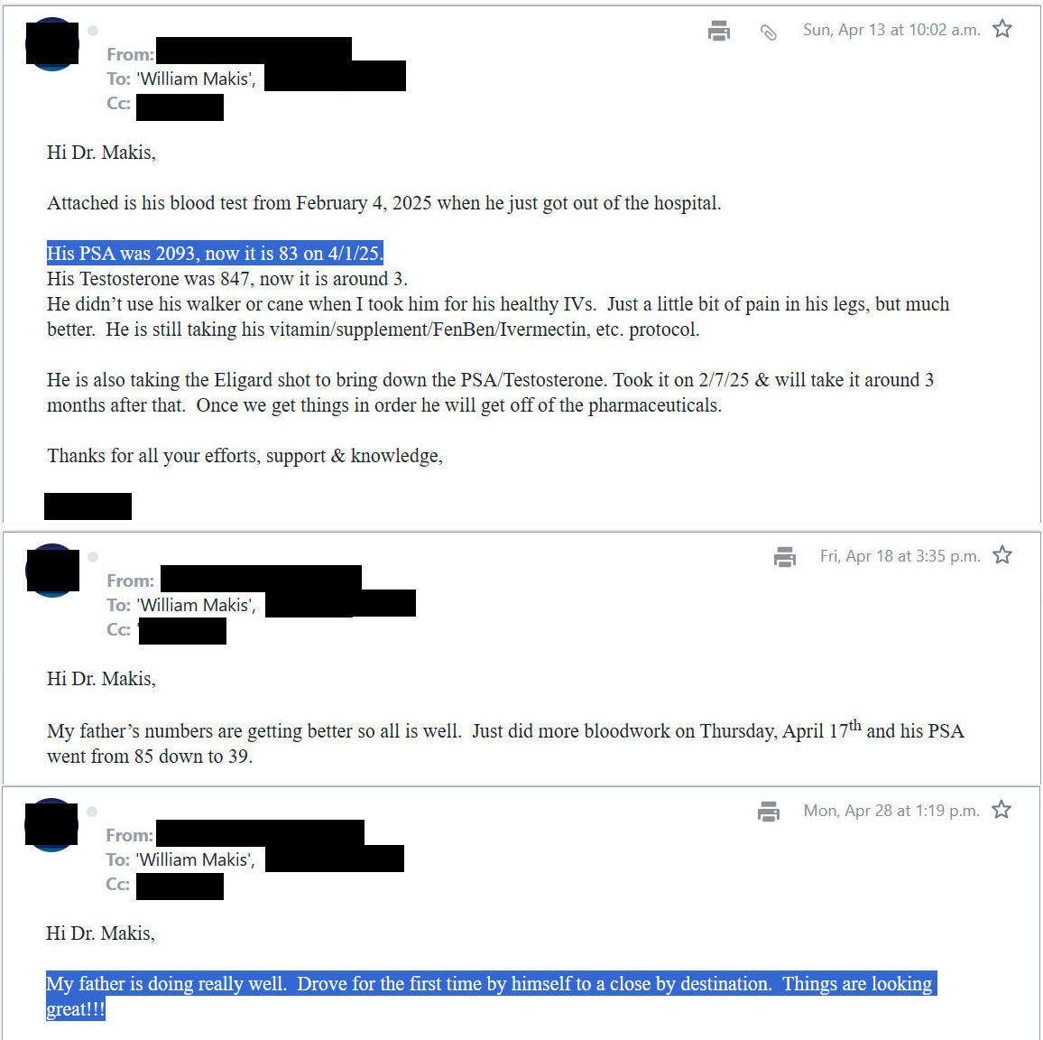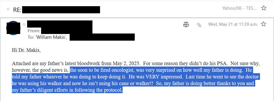 April 13: "His PSA was 2093, now it is 83 on 4/1/25. He didn’t use his walker or cane when I took him for his healthy IVs. Just a little bit of pain in his legs, but much better."