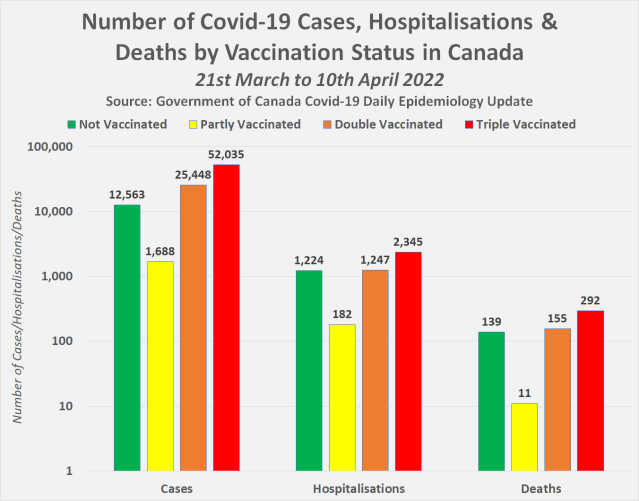 And here’s a chart showing the true number of cases, hospitalisations and deaths by vaccination status in Canada between 21st March and 10th April 2022 (The numbers have been calculated by performing simple subtraction on the two tables above) –