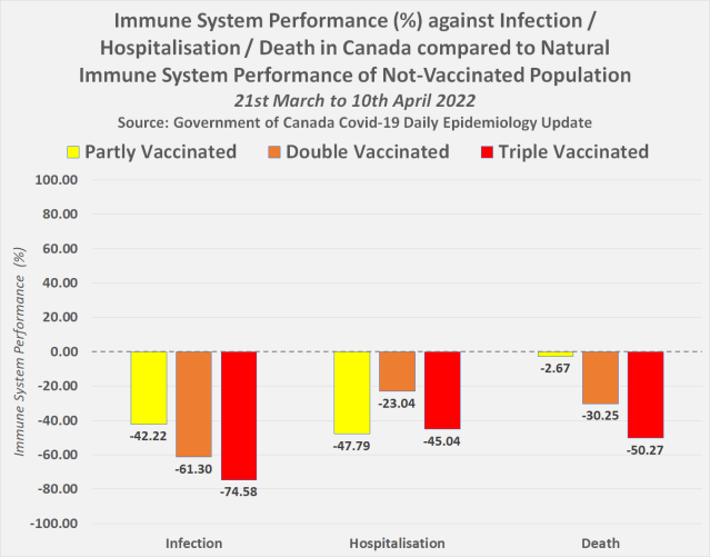 Here’s a chart showing the immune system performance against infection, hospitalisation and death in Canada between 21st March and 10th April 2022 –
