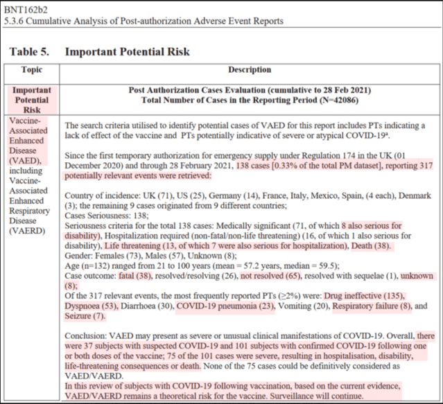 However, of the information collated by Pfizer so far in the ongoing study they have conducted, it is clear to see that they were fully aware in February 2021 that antibody-dependent enhancement was a possible consequence of their Covid-19 injection, and it appears they also knew by April 2021 that the phenomenon was killing people.