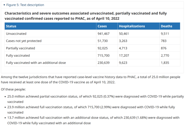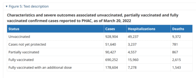The figures on Covid-19 by vaccination status are produced by the Government of Canada, the latest of which are presented in the following table taken from their report –
