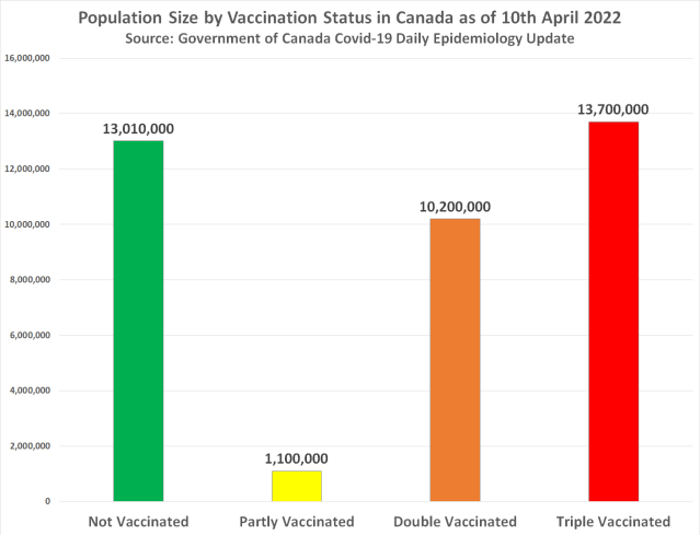 According to the Government of Canada, 25 million people have had at least 1 dose of the Covid-19 vaccine. This means 13.01 million people have not. Here’s a chart showing the population size by vaccination status in Canada as of 10th April 2022 –