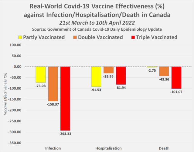Here’s a chart showing the real-world Covid-19 vaccine effectiveness in Canada against infection, hospitalisation and death between 21st March and 10th April 2022 –