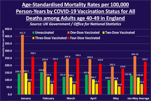 The graph above shows more clearly how the four-dose and one-dose vaccinated dramatically surpassed unvaccinated 40-49-year-olds in terms of mortality rates per 100,000.
