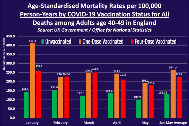 It shows that the January to May average mortality rates were 132.08 per 100,000 among the unvaccinated, 264.14 per 100,000 among the one-dose vaccinated and 225.2 per 100,000 among the four-dose vaccinated. Meaning, on average, the one-dose vaccinated were 100% more likely to die than the unvaccinated, and the four-dose vaccinated were 71% more likely to die.