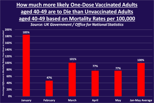 While in January, the one-dose vaccinated were 185% more likely to die than unvaccinated 40-49-year-olds.