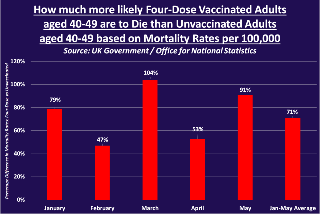 However, a month-by-month analysis shows that in March, the four-dose vaccinated were 104% more likely to die than unvaccinated 40-49-year-olds based on mortality rates per 100,000.