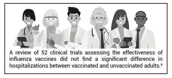 In addition, a 2018 Cochrane review6 of 52 clinical trials assessing the effectiveness of influenza vaccines did not find a significant difference in hospitalizations between vaccinated and unvaccinated adults. Instead, the reviewers found “low-certainty evidence that hospitalization rates and time off work may be comparable between vaccinated and unvaccinated adults.”