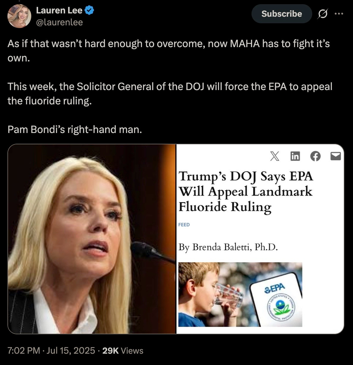 As RFK Jr. has been diligently working to remove fluoride from America’s water supply, as well as ban soft drinks from SNAP welfare, and toxic food dyes and chemicals from school lunches…