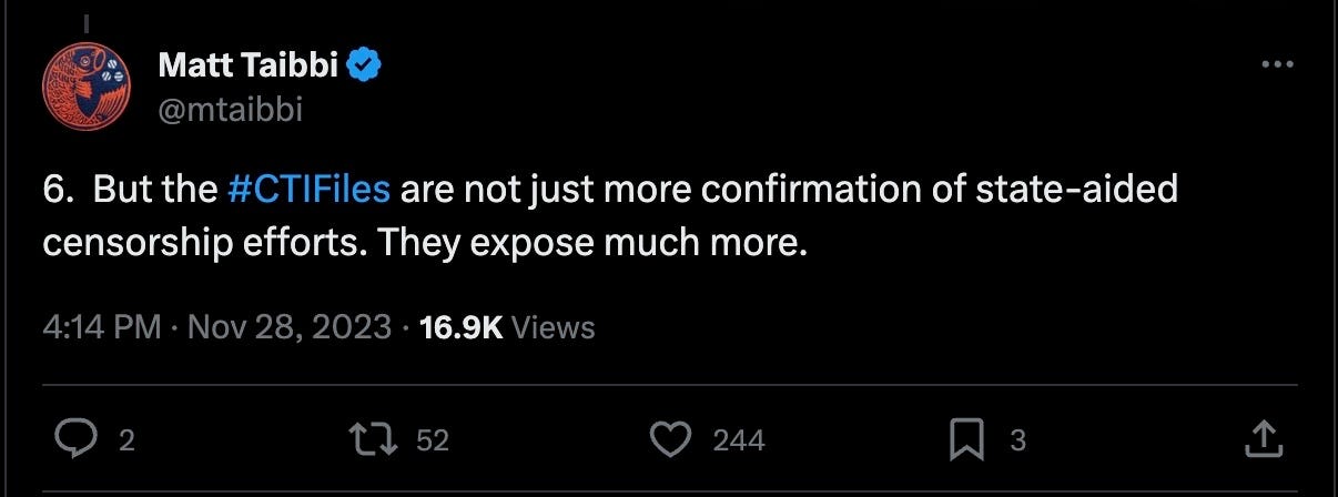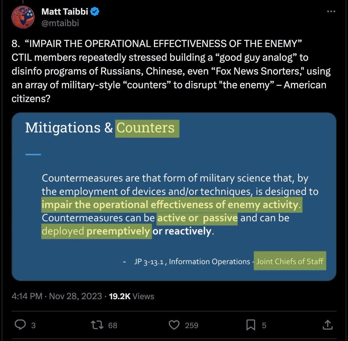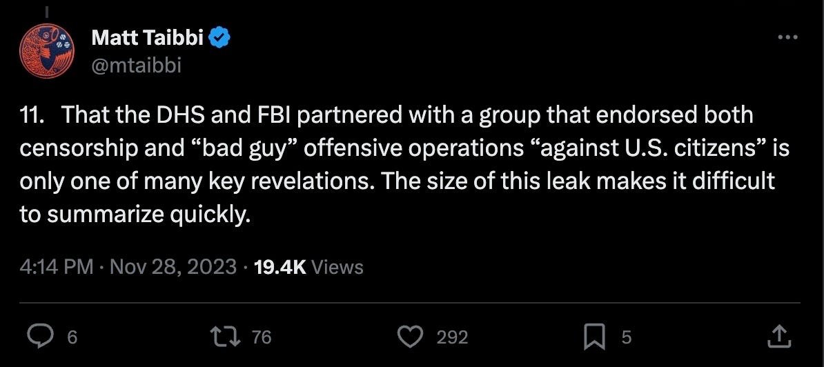 Which brings us to Matt Taibbi’s controlled release of Deep State “secrets” regarding a shadowy group tasked with fighting COVID-19 “disinformation.” Looking back at these governmental disinfo agents accusing everyone else of their crimes will allow us to anticipate their next round of social engineering games: