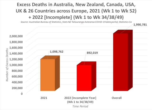 The data provided to the Organisation for Economic Co-Operation and Development (OECD) and EuroMOMO by official Government departments points to a significant increase in excess deaths since the rollout of Covid-19 vaccines in the USA, Canada, New Zealand, Australia, the UK and half of Europe. (Source)