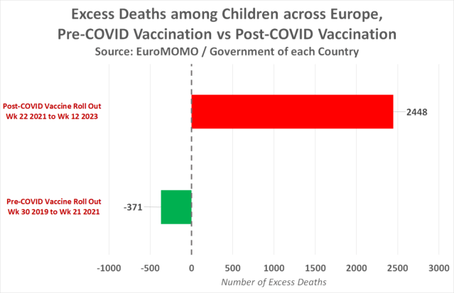 Excess deaths among children aged 0 to 14 across 27 countries across Europe, including the UK, France, Spain, Italy and most of Germany, increased by 760% up to week 12 of 2023 following the European Medicines Agency extending the emergency use authorization of the Pfizer COVID-19 vaccine to children aged 12 to 15. (Source)