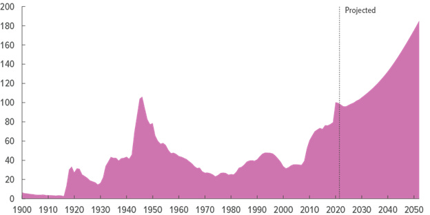 “Debt held by the public is projected to rise by 66 percent (in nominal terms) over the next 10 years, increasing from $24.2 trillion at the end of 2022 to $40.2 trillion at the end of 2032. Relative to the size of the economy, debt is projected to increase from 98 percent of GDP at the end of this year to 110 percent of GDP in 2032.”