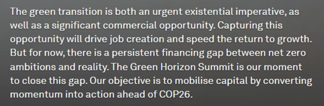 The Summit was hosted by the City of London Corporation, in collaboration with the Green Finance Institute, and supported by the World Economic Forum (“WEF”): “It’s time to reset the relationship between finance and the real economy. It’s time for public and private finance to get behind the transition to a sustainable and resilient future for all.”
