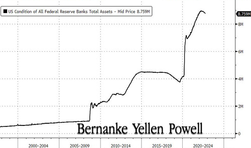 Bernanke served as chairman of the Fed between 2006-14 and famously unleashed a tidal wave of debt monetization by the central bank during the GFC over a decade ago to save the so-called 'too big to fail' banks. At the time, the Fed's balance sheet was approaching $2.5 trillion. Multiple rounds of money printing later and a massive expansion during the Covid crisis, the balance sheet stands at around $9 trillion today.