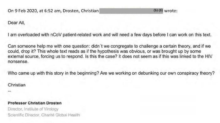 In any case, thanks to a FOIA request, we know that Drosten participated in February 2020 email exchanges with Anthony Fauci and other international scientists about the possibility of a lab leak and that he was in fact, in contrast to other participants, particularly irritated about the hypothesis. Several of the others – including, n.b., Anthony Fauci – are clearly willing to entertain the possibility of a lab leak, and Jeremy Farrar of the Wellcome Trust even says that he is split 50:50 between lab leak and natural origin and that Edward Holmes of the University of Sydney is even 60:40 lab leak.