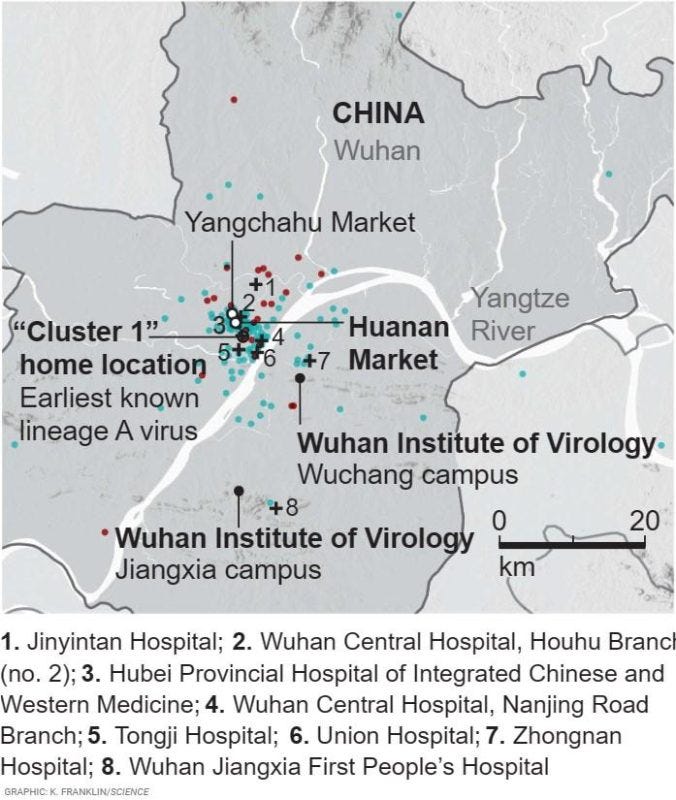 The below map from the Science article makes the distance of the cluster from the two campuses of the Wuhan Institute of Virology clear – although the article itself coyly refrains from referring to the Institute.
