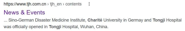 A Google search result from the Tongji website (see below) tantalizingly notes that a “Sino-German Disaster Medicine Institute, Charité University in Germay [sic.] and Tongji Hospital was officially opened in Tongji Hospital, Wuhan, China.” But the indexed Tongji news article is not available nor is it cached, and the URL is not archived by the Wayback Machine either. Could this be the event at which Drosten is pictured? Perhaps Drosten could clarify.