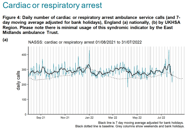 The following chart is taken from the UK Health Security Agency’s ‘Ambulance Syndromic Surveillance System – Week 30′ bulletin, and it shows the daily number of 999 calls requesting an ambulance due to suffering cardiac arrest in England vs the expected rate (black dotted line).