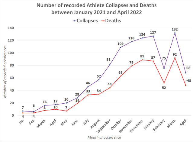 The following chart shows the number of recorded athlete collapses and deaths between January 2021 and April 2022, courtesy of the linked list above –
