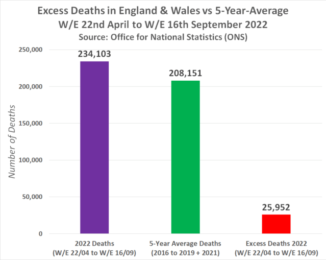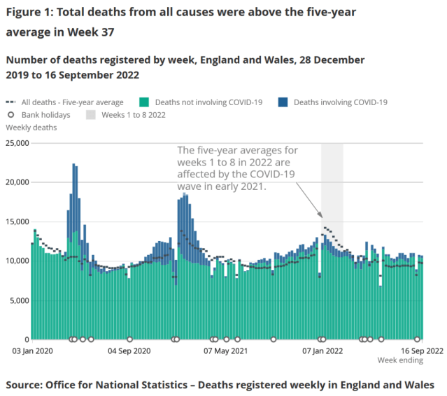 The Office for National Statistics (ONS) publishes weekly figures on deaths registered in England and Wales. The most recent data shows deaths up to 16th September 2022.