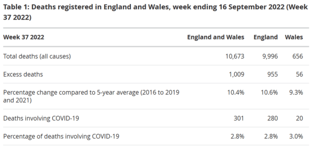 The most recent week shows that there were 10,673 deaths in England and Wales, equating to 1,009 excess deaths against the five-year average. Only 301 of those deaths were attributed to Covid-19.