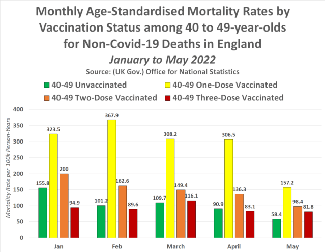 The following charts show the monthly age-standardised mortality rates by vaccination status among each age group for Non-Covid-19 deaths in England between January and May 2022, the figures can be found in table 2 of a recently published dataset collated by the UK Government agency, the Office for National Statistics –