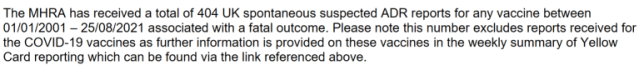 The Medicine and Healthcare product Regulatory Agency (MHRA) confirmed in response to a Freedom of Information request (FOI) that had received a grand total of 404 reported adverse reactions to all available vaccines (excluding the Covid-19 injections) associated with a fatal outcome between the 1st January 2001 and the 25th August 2021 – a time frame of 20 years and 8 months.