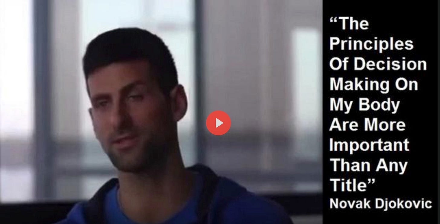 GOD Bless you Novak Djokovik!!! Thank you for standing firm for what you believe and for not bowing a knee to ABJECT INSANITY: That an athlete of your young age and physical prowess needs this mRNA gene altering bioweapon to protect them from a disease 🦠 that they basically have no chance of dying from, yet must take it to compete in a sporting event!!! I am 100% sure that every major sports athlete in the world that took this shot wishes now, more than ever, they had followed in your footsteps instead of following the lemming herd right off the cliff!!!