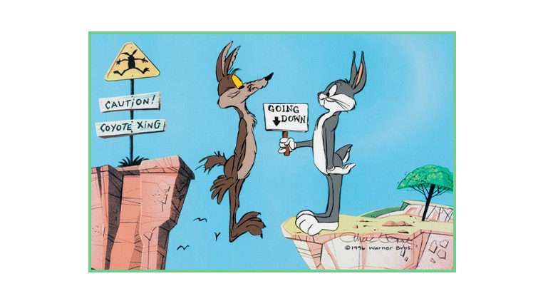You may think it strange to bring physics into a discussion about Wily Coyote, but you have to admit that there is a consistent yet subtle reference to the strangeness of the quantum world in the cartoon above. If you remember, Wily frequently finds himself in the position of going past the edge of the cliff, generally as a result of over-pursuit of the Roadrunner, or occasionally the Wabbit, as we see here. What happens next is fascinating: gravity ignores his mid-air status until he looks down and suddenly realizes his predicament, whereupon he falls instantly. You may remember from your introductory quantum physics the fascinating “observer effect” leading to wave-form collapse. Most know of this effect through a simple example called Schrodinger’s Cat. Something tells me that the writers of the cartoon understood this topic of quantum decoherence quite well and played with it knowing that very few would get the joke. Most would just see that Wily has a sudden realization – and then he falls.