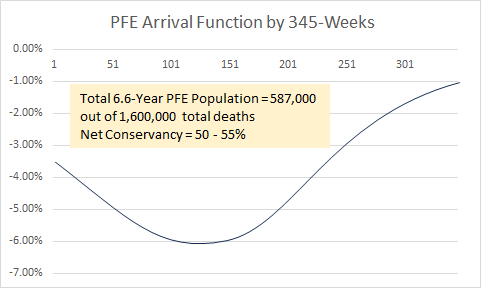 The function we currently use for PFE is described by 6.6 years (345 weeks – April 2021 – Oct 2027) of Chi-squared arrival, with an anticipated x_mode (function peak) of mid-late 2023 at 6.02% of Excess Non-Covid Natural Cause Mortality. Only 587,000 of the net 1.3 million older person deaths are claimed inside this entire PFE function. The arrival argument is depicted to the right, as well as in this PFE Reference and Calculation Basis Chart.