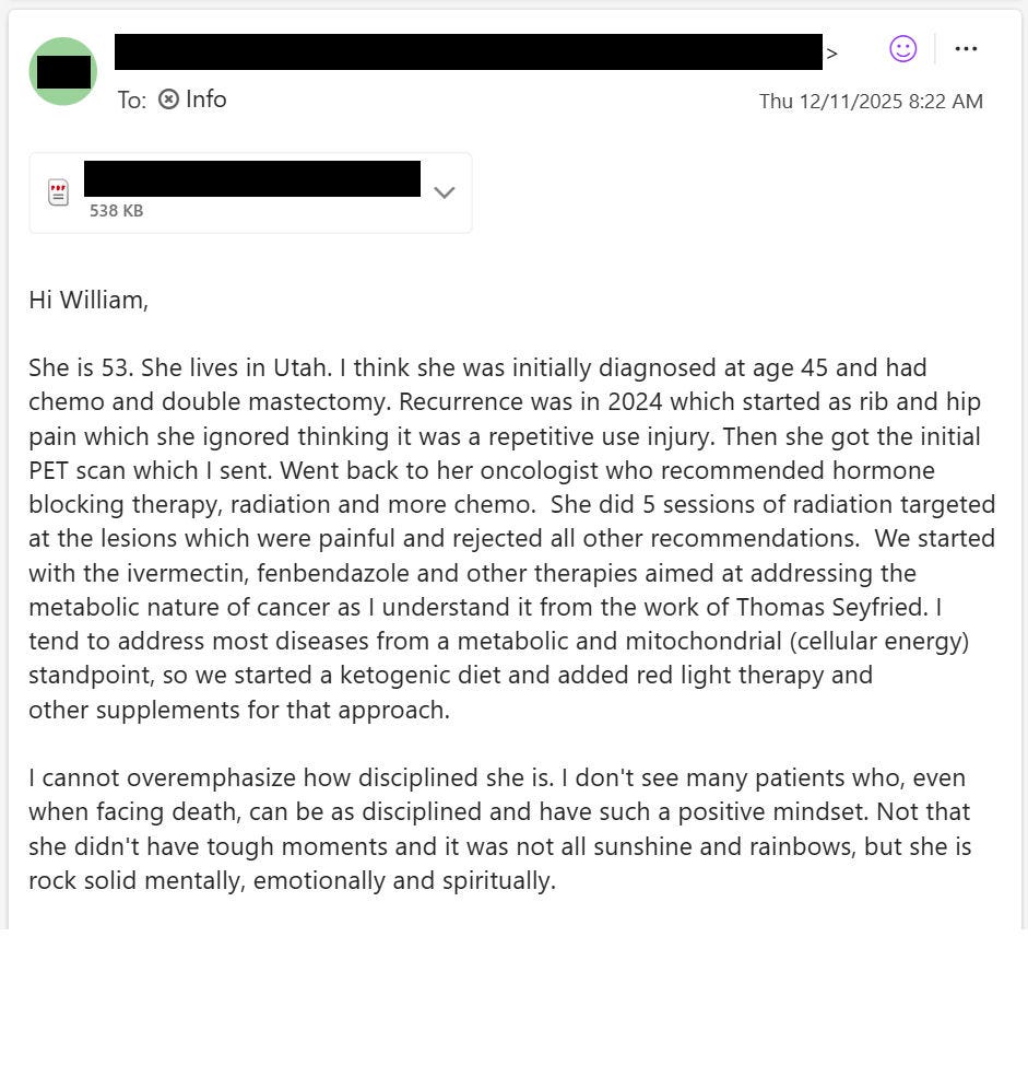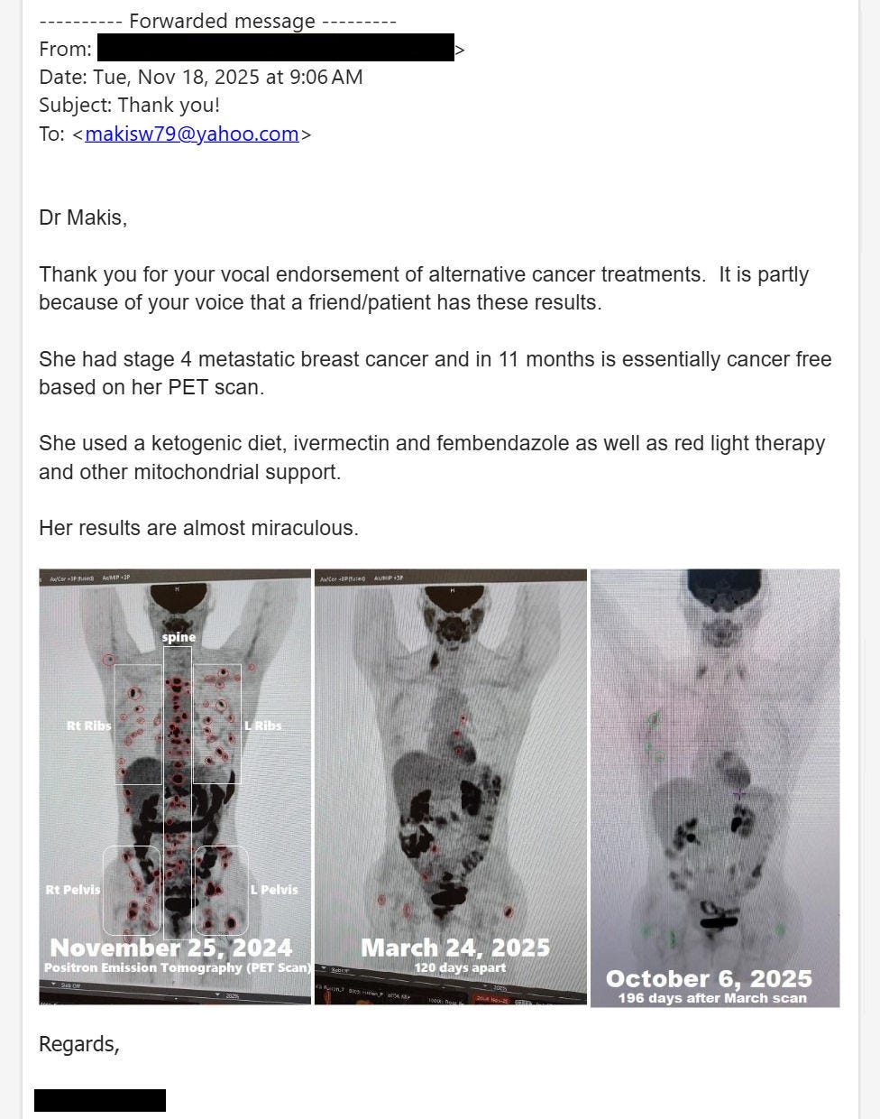 “Thank you for your vocal endorsement of alternative cancer treatments. It is partly because of your voice that a friend/patient has these results”