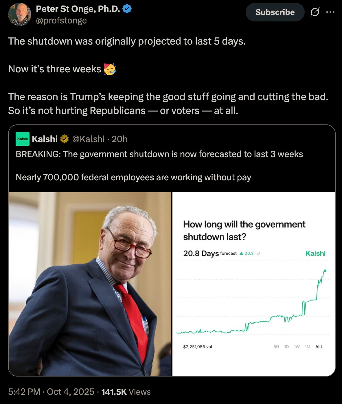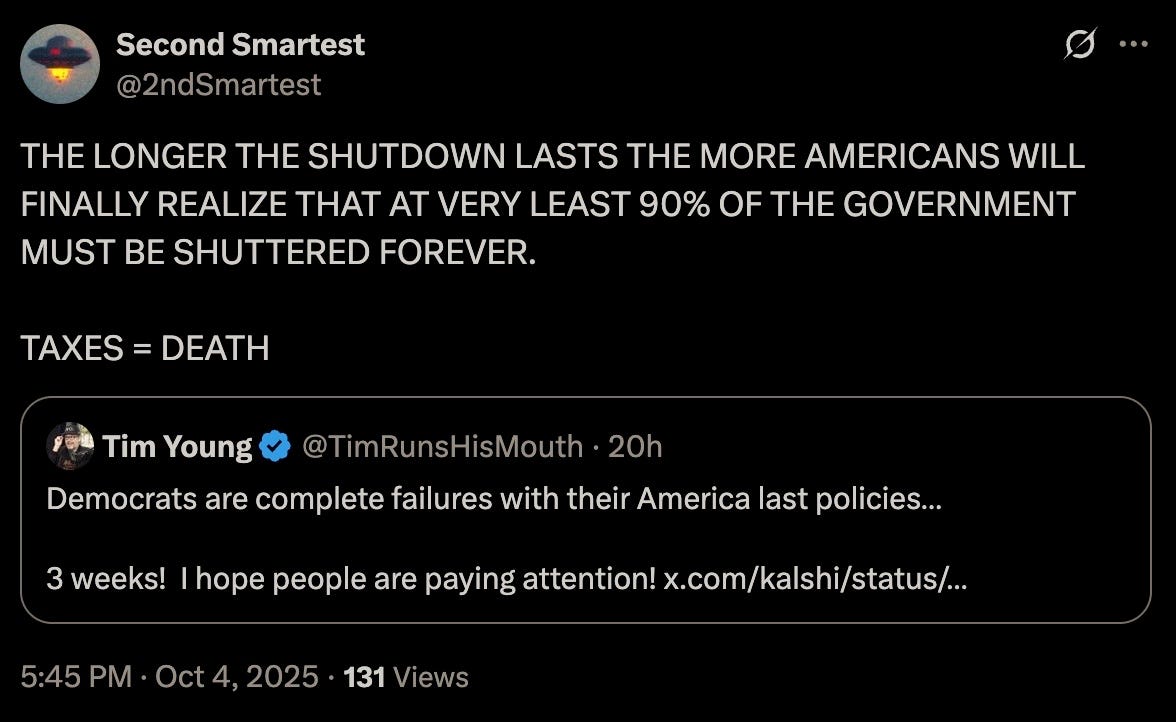 This Substack has been diligently reporting on this most welcome shutdown of the metastasizing abomination that it is the illegitimate Federal government…