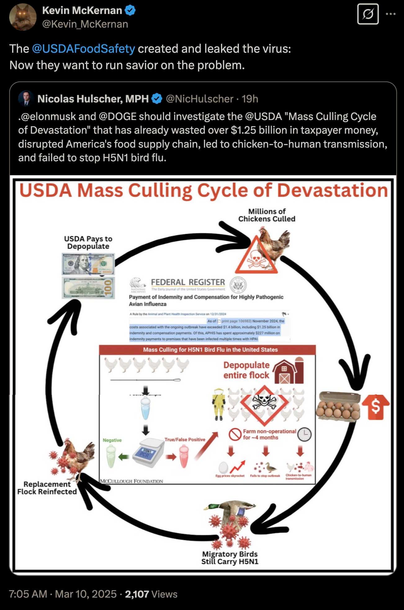And just like during the last viral crime against humanity, the solution is once again far worse than the disease; in other words, just like the Modified mRNA slow kill bioweapons that were injected into millions of fearful humans, so too does the USDA, CDC, FDA, NIAID, NIH, et al. want to poison all of the livestock with their latest PSYOP-BIRD-FLU “vaccines” that they are also angling at some point in the not so distant future to inject into humans as well.