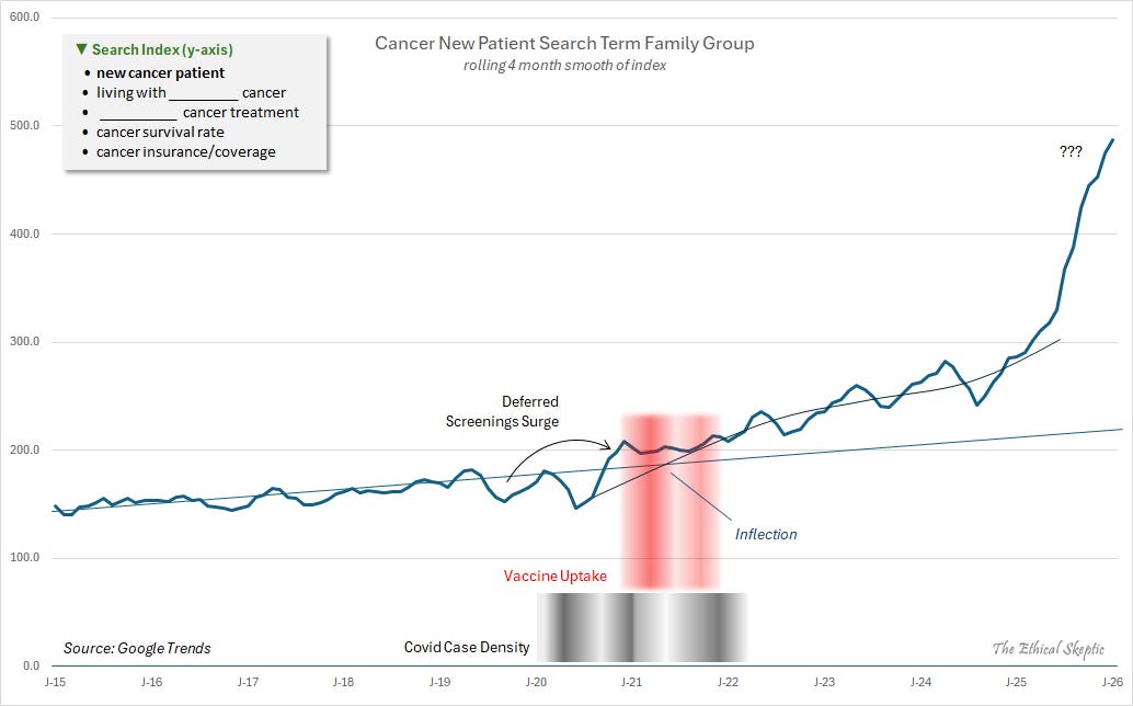 What makes this signal concerning is the combination of factors: the rise in less common cancers, their novel prevalence among traditionally less-susceptible cohorts, and the signal’s overall magnitude (despite a shrink-reduced candidate population)