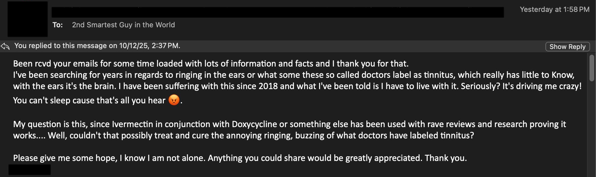 The email reply concluded that we may extrapolate that Ivermectin may attenuate tinnitus, as well as all of the other “vaccine” induced adverse events.