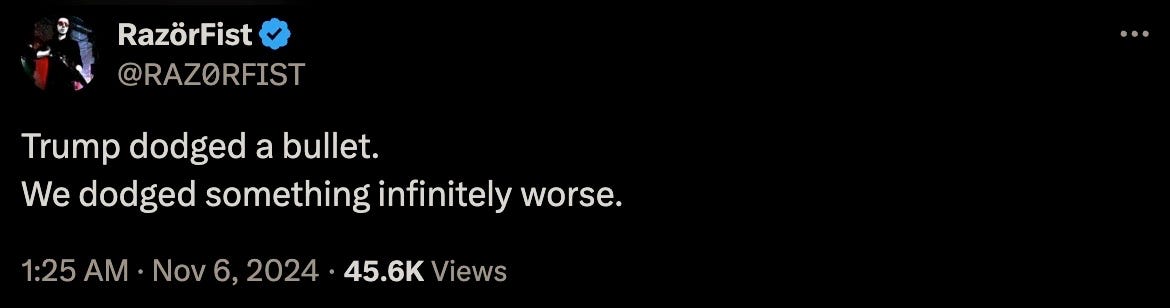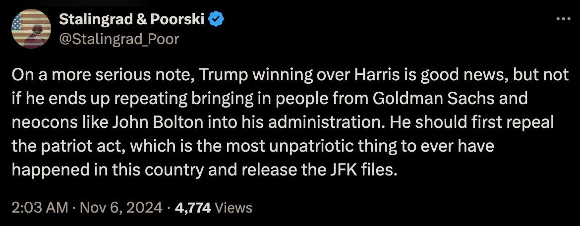 Alright we can take a sigh of relief and enjoy the victory, then get back to work. One thing Trump and Kennedy need to do is keep their the Private Security Teams.. then really vet the Secret Service.. teams.. Elon too... pink slips are gonna fly soon for the criminal industrial complexes and who will definitely keep Hit teams chasing these 3 agents of Real change.. This is the new paradigm and Big Brother is going to fight to the death to defeat it... Eternal Vigilance, I pray it's Trump's daily motto..