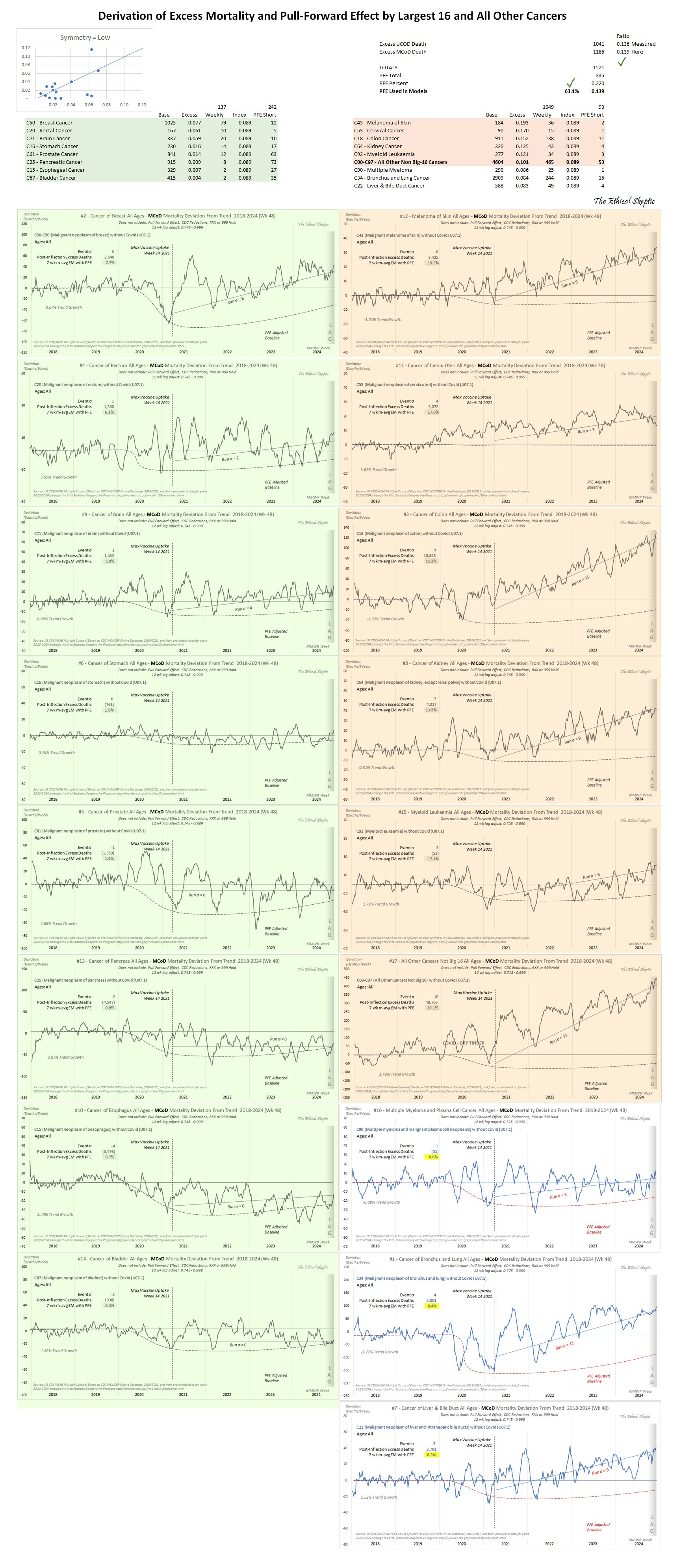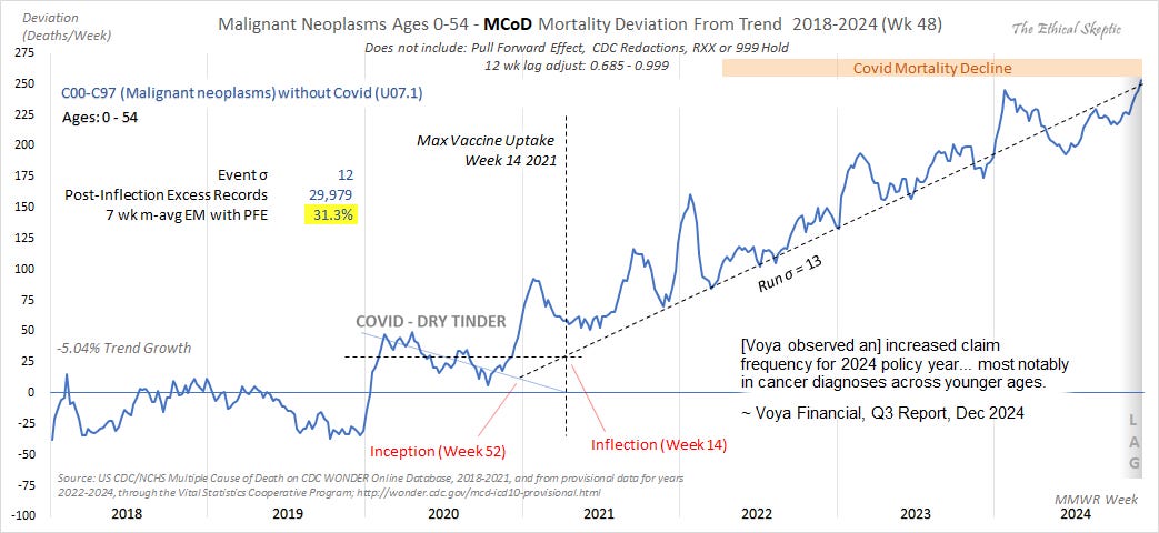 The NCHS/CDC data is clear (below). Cancer mortality and treatment expense are far into excess above trend, and both inflected the week of maximum Covid vaccine uptake peak.